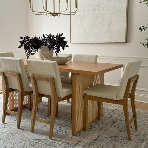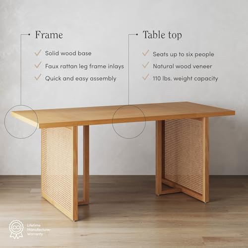 Nathan James Willow Boho Dining Table for 6 with Solid Wood Legs, 6-Person Natural Wood Dining Table, Warm Pine or Brown with Bohemian Rattan Accent