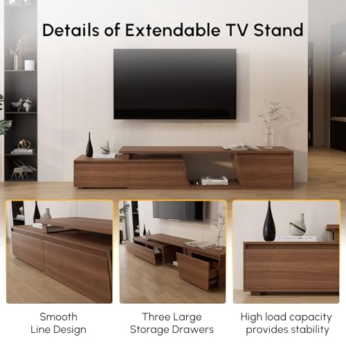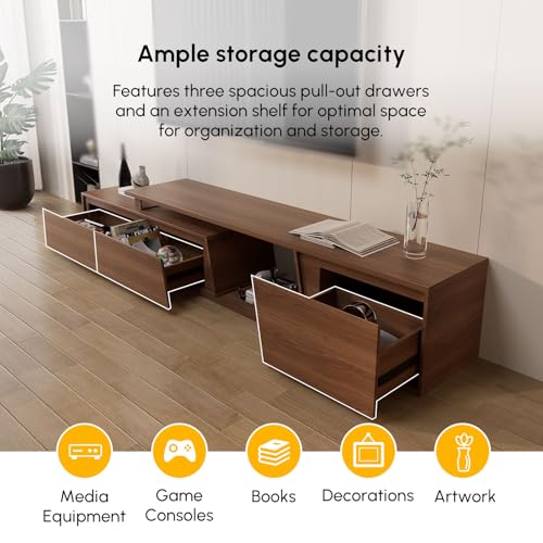 homary TV Stands for Living Room, Walnut Extendable TV Console Table, Minimalist Rectangle Entertainment Center with 3 Drawers Up to 110″ (Extendable: 70.9”W-110.2”W)