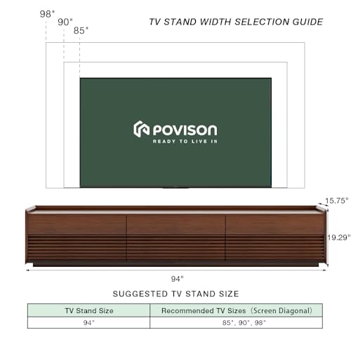 POVISON Fully-Assembled Mid Century Modern TV Stand, 94.49″ Wood Media Console with Adjustable LED Light, Entertainment Center with Storage for Living Room