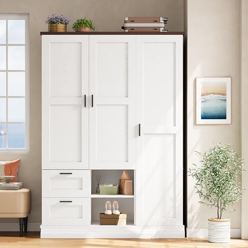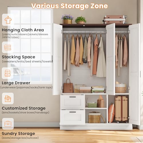 IRONCK Armoire Wardrobe Closet with 2 Drawers, 3 Doors, 2 Hanging Rods, Wardrobe Cabinet, Wooden Freestanding Bedroom Closet Cabinet with Adjustable Shelf, Storage Armoire, Rustic White