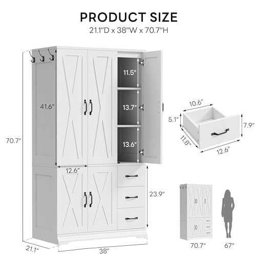 Spacious Closet Storage: Measuring 21.3”D x 38”W x 70.9”H, this wardrobe cabinet offers ample space for clothes, bedding, shoes, and more. Its 21.3-inch depth easily fits larger hangers, and the sturdy metal hanging rod won’t warp