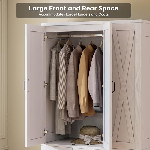 Stylish Design: The classic X-shaped barn doors of this armoire add a touch of rustic charm to your bedroom. Its exquisitely crafted metal handles boost elegance, while the sleek base design creates a light feel. Installed seamlessly, it crafts a stylish look for your wardrobe