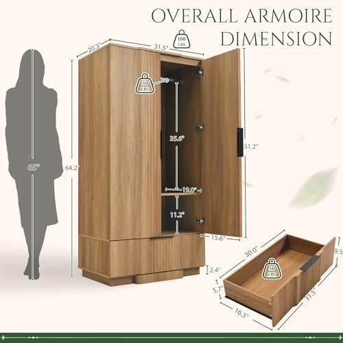 Yechen 64″ Fluted Armoire Wardrobe Closet with Doors and Drawer, Wooden Wardrobe Closet Cabinet with Adjustable Shelve, Modern Small Armoires Storage Clothes, Coats for Bedroom, Natural