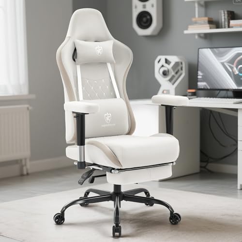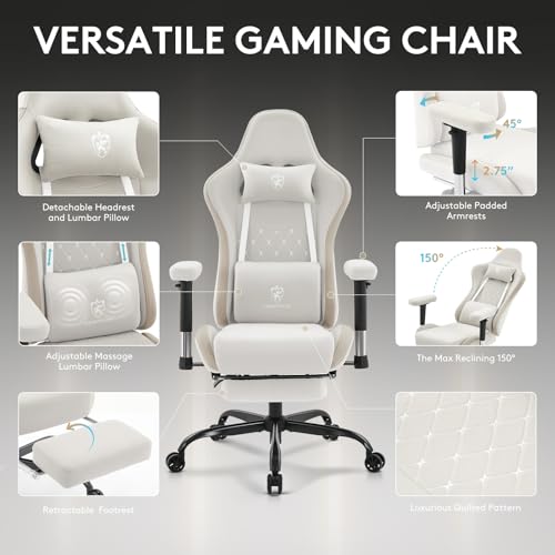 Gaming Chair Breathable Fabric,Computer Office Chair with Footrest,Massage Lumbar Support and Gel Pad,Ergonomic Reclining Gamer Chair with Adjustable Armrests and Spring Cushion Beige