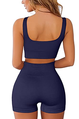QINSEN Workout Sets for Women 2 Piece Seamless Ribbed Crop Tank High Waist Shorts Yoga Outfits