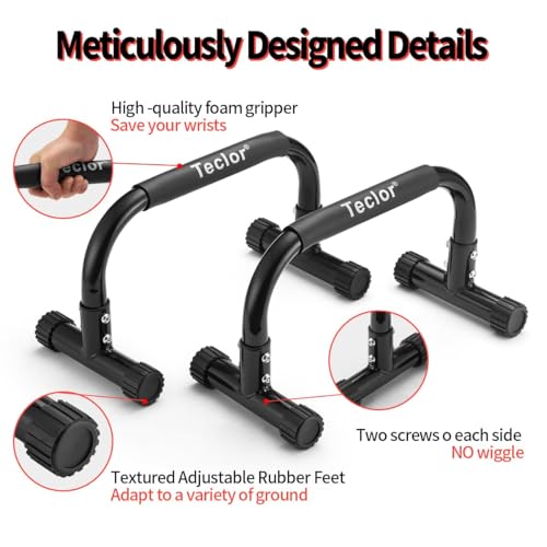 😉【Heavy-duty & Stable Design】 Teclor push up bar can carry up to 660LBS. It is made of fully welded heavy duty steel. The thickness of the steel tube is 2mm, real manual measurement, absolute commercial material. Ergonomic design provides absolute stability. Two screws on each side versus one and great bar diameter to increase the stability of the push-up bar.