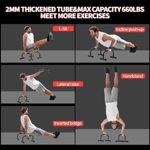🤝【Perfect Size】 The parallettes size L:17in* W:8.3in *H:9.5in, 1.5in diameter, 0.079in (2mm) tube thickness. Commercial thickness can fully support 660LBS. Extended handle and perfect height provide the right space great for you to do dips, pushups, V-sits, L-sits, tuck, planche, handstand push ups, ab workouts , stretches and many more bodyweight strength training.