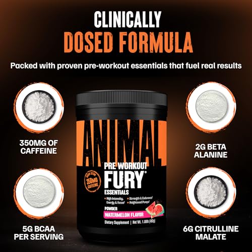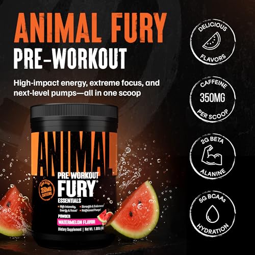 Animal Fury Pre Workout Powder Supplement for Energy and Focus 5g BCAA 350mg Caffeine Nitric Oxide Without Creatine Powerful Stimulant for Bodybuilders, Watermelon