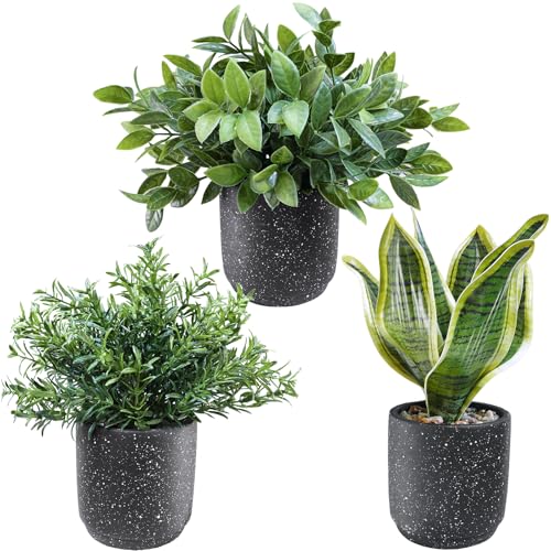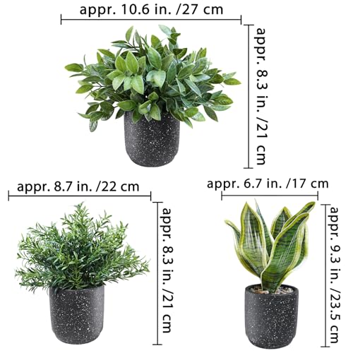 Winlyn 3 Pack Small Potted Artificial Plants Faux Greenery Rosemary Boxwood Snake Plants in Black Cement Planters Decorative Plants 8.3″-9.3″ Tall for Home Office Bathroom Kitchen Shelf Table Décor