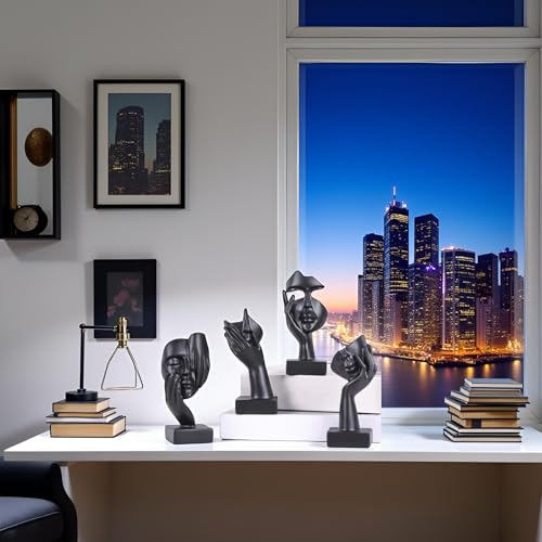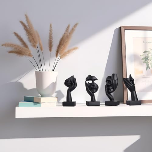4 PCS Black Thinker Statue Set – Abstract Sculptures Home Decor for Bookshelf, Office, TV Stand Knick Knacks – See No Evil, Hear No Evil, Speak No Evil Figurines, Unique Gift for Women