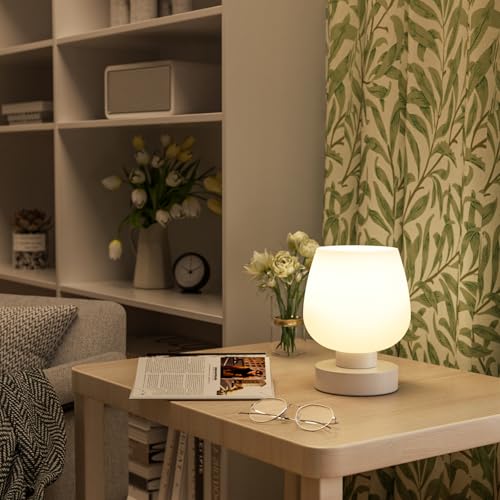 Touch Table Lamp for Nightstand – Small Bedside Lamp for Bedroom Living Room Night Stands, Desk Lamp with White Glass Shade for Small Spaces, 3 Way Dimmable, LED Bulbs, Gifts