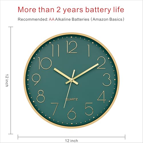 Foxtop Modern Wall Clock 12 Inch Silent Non Ticking Battery Operated Round Quartz Gold Wall Clock for Living Room Bedroom Kitchen Office Classroom Decor (Dark Green Dial)