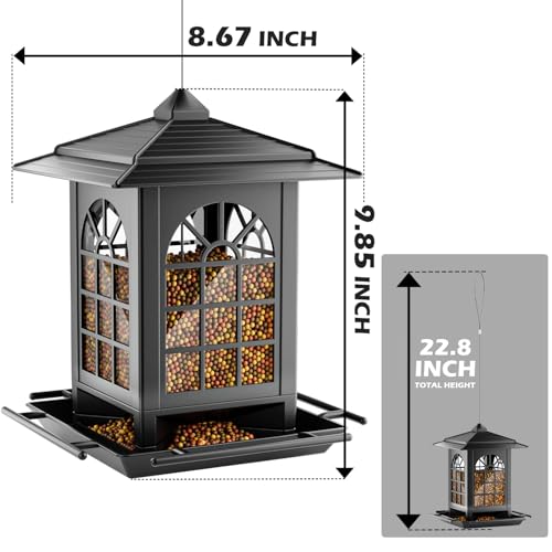 DRAW MORE BIRDS WITH THE RIGHT SEEDS: Measuring 8.67 x 8.67 x 9.58 inches, this hanging bird feeders holds up to 7 pounds (2 PACK) of seeds. Sunflower and niger seeds attract cardinals, goldfinches, and chickadees, while bluebirds are drawn to insects.While insects appeal to Bluebirds