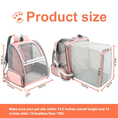 ★ Pet Backpack Dimensions:12.6″ L x 11.4″ W x 16.5″ H. Expanded size: 13.8″L x 9.3″W x 14.2″H. Perfect for dogs up to 15-pounds, or cats up to 18-pounds. Easily fits cats, small dogs, and most other small/medium-sized pets! Please make sure your pet sits within 14.5 inches overall height and 12 inches wide.