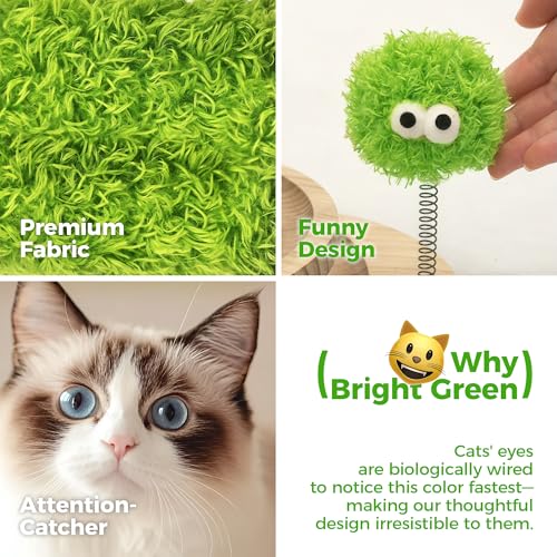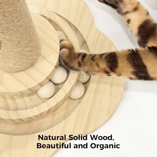 4 in 1 Interactive Play: Sisal-wrapped scratching post keeps claws healthy and sharp; 2 layers solid wood ball turntable with three balls per track encourages batting and chasing, improving agility; Spring plush ball with green eyes on the base adds bounce for endless fun; Two feather sisal balls hanging from the top attract cats to jump, swat, and stay active.