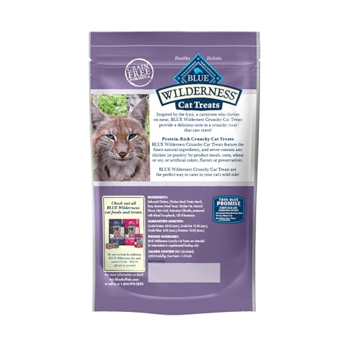 Reward your cat with a scrumptious, meat-rich treat inspired by her wild ancestors. BLUE Wilderness Crunchy Cat Treats cater to your cat’s natural cravings for real meat by starting with more of the tasty, high-quality protein cats love. Oven baked for a healthy crunch, these grain-free treats will truly satisfy your cat’s wild side. And with real meat first and NO poultry by-product meals, these Blue Buffalo cat treats feature the ingredients you’ll feel good about giving.