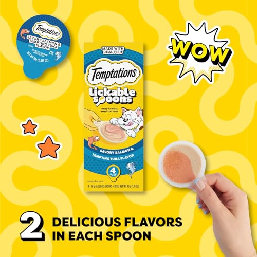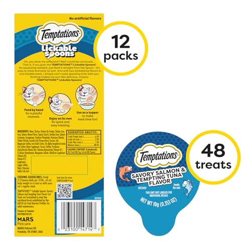 Temptations Lickable Spoons Adult Wet Cat Treat, Savory Salmon and Tempting Tuna Flavor, 4 Spoons, Pack of 12 (48 Total Treats)