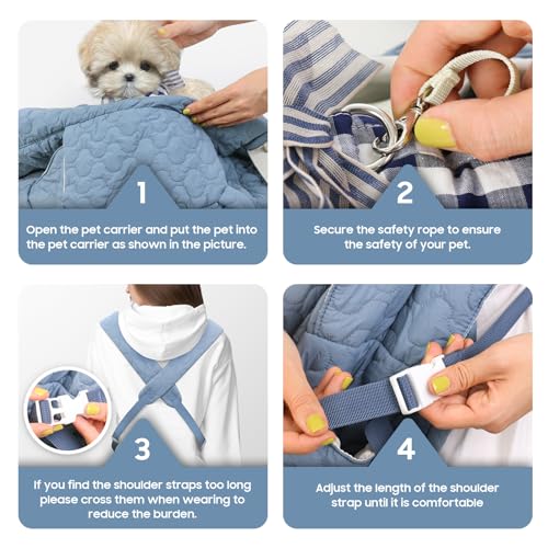 【Multiple Pocket Design】: Our Pet Carrier Backpack is equipped with multiple pockets, including two side pouches and front and rear zippered pockets, offering ample storage for essentials like snacks, waste bags, your wallet, phone, or keys. Everything you need is within easy reach. (𝐏𝐥𝐞𝐚𝐬𝐞 𝐧𝐨𝐭𝐞: If you find the straps too long, cross them when using to prevent slipping off your shoulders. For step-by-step instructions, please refer to Figure 4.)