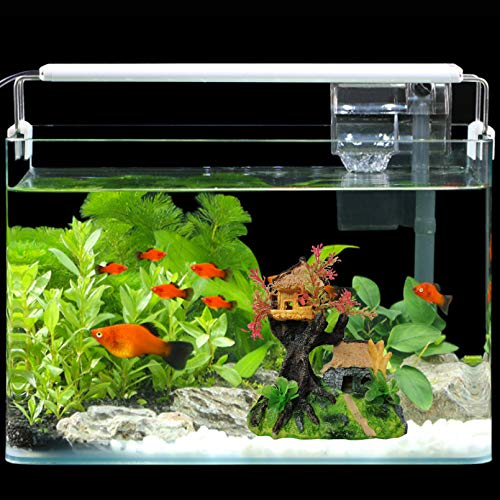 Size: Aquarium classical landscape ornaments is 5.9×4.1×6.7 inches. Both fake plants are 4 inches. Aquarium decorations would provide shelter for your fish and satisfies the need for aquarium animals to instinctively find privacy and overhead coverage. With gate and openings, fish can take shelter, play and swim through