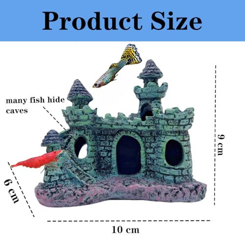[Note] – The castle measures 11 x 9 x 6 cm. The hide hole is about 3 x 2 cm ,The hide holes designs to be small to protect small fish and fish larvaes, big fish can not get in (betta fish can not hide in due to its size, but it can be used as betta tank decor ), It is a small-sized ornament, it can allow small fish,young fish, fish larvaes, shrimp, crab to hide ,, perfect for small to medium aquariums decor.