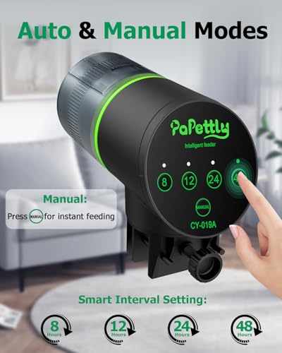 One-click Setup: Papettly automatic fish feeder offers 4 interval settings: just press the button on the settings page, it will automatically rotates feeding every 8/12/24/48 hours, which means feeding 3/2/1 a day and 1 time every other day. For instant feeding, just press the MANUAL button for immediate food dispensing. NOTE: Small fish are recommended feeds every 24 hours