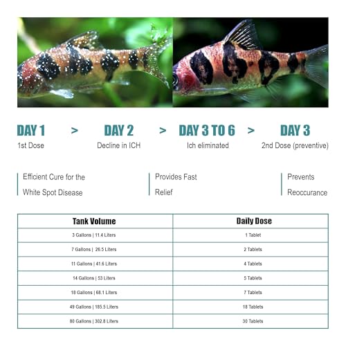 Safe for fish, shrimp, snails, and live aquatic plants, this non-toxic formula targets the Ich parasite without harming your aquatic inhabitants. The fast-acting tablets dissolve easily in water, providing quick and effective relief from white spot disease. This powerful, natural formula works quickly, eliminating Ich by Day 3 to Day 6 of treatment. With 60 tablets included, it provides long-lasting protection and treatment for tanks of various sizes.